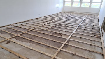 Bei diesem Beispiel, ein Tanzboden der Sarrotiehöfe, wurde ein Schwing- Trägerverfahren angewendet, um den Estrich nicht zu beschädigen.